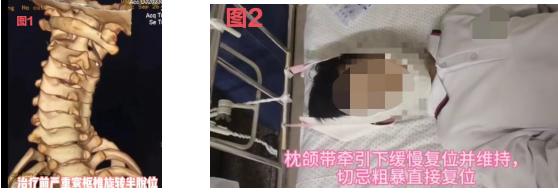 兒童寰樞椎半脫位早期治療并不復(fù)雜,關(guān)鍵時(shí)要高度重視及時(shí)就診正規(guī)治療,切勿亂投醫(yī),勿要不正規(guī)盲目簡單粗暴快速手法復(fù)位。要盡早至脊柱??疲\斷明確后一般不需要輸液、抽血等不必要檢查,通常應(yīng)用枕頜帶(Glisson)平臥位取正中位牽引(見圖2),傷后2天內(nèi)盡可能持續(xù)小重量牽引,牽引過程中會(huì)緩慢糾正寰樞椎半脫位,牽引重量實(shí)用骨科學(xué)建議兒童約1.5-2kg即可,一般1-3天復(fù)位,兒童表現(xiàn)為頸部旋轉(zhuǎn)功能恢復(fù),疼痛消失??蛇M(jìn)一步復(fù)查X線或CT了解復(fù)位情況,盡可能牽引1-2周。然后可以進(jìn)一步頸托固定保護(hù)約1月為宜。治療不及時(shí)發(fā)生旋轉(zhuǎn)固定半脫位或嚴(yán)重陳舊半脫位,會(huì)導(dǎo)致頸疼、斜頸、斜視、面部不對稱,保守?zé)o效時(shí)需要手術(shù)治療。當(dāng)然我們盡可能要避免這種結(jié)局。
