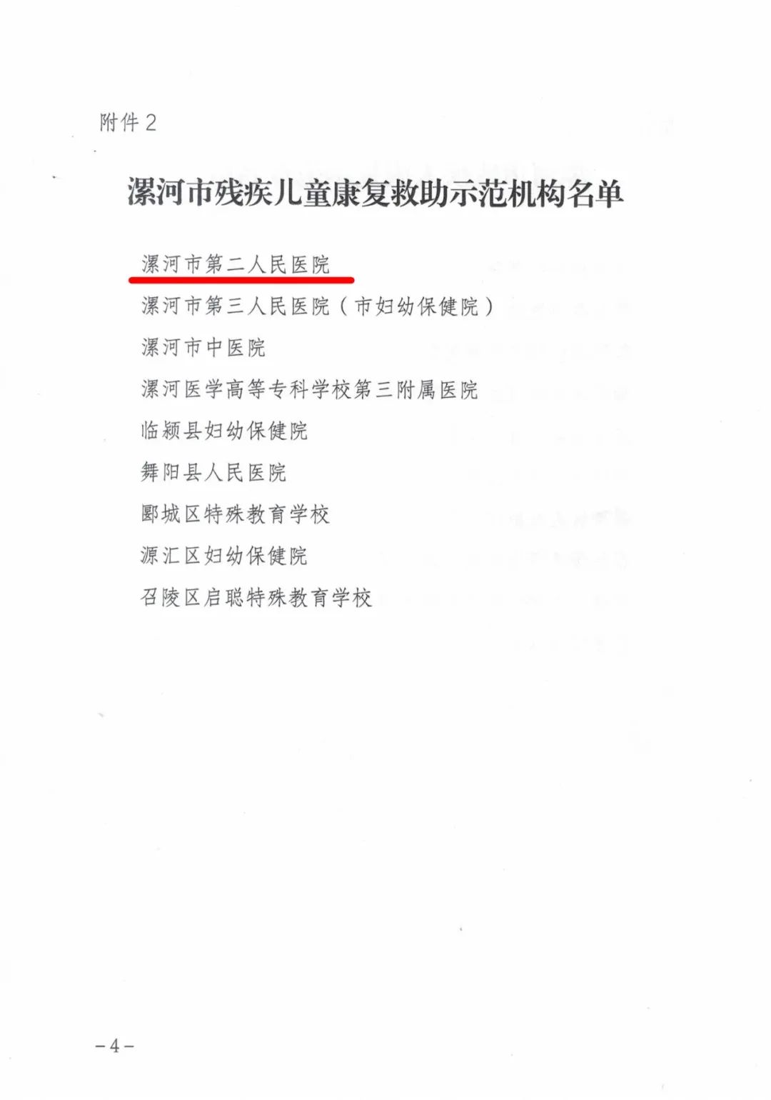 11月21日,根據(jù)《關(guān)于開展漯河市殘疾人康復(fù)示范點和殘疾兒童康復(fù)救助示范機(jī)構(gòu)創(chuàng)建活動的通知》要求,經(jīng)機(jī)構(gòu)自薦申請、市殘聯(lián)復(fù)審等各環(huán)節(jié)工作,市二院被漯河市殘疾人聯(lián)合會命名為市殘疾兒童康復(fù)救助示范機(jī)構(gòu)。