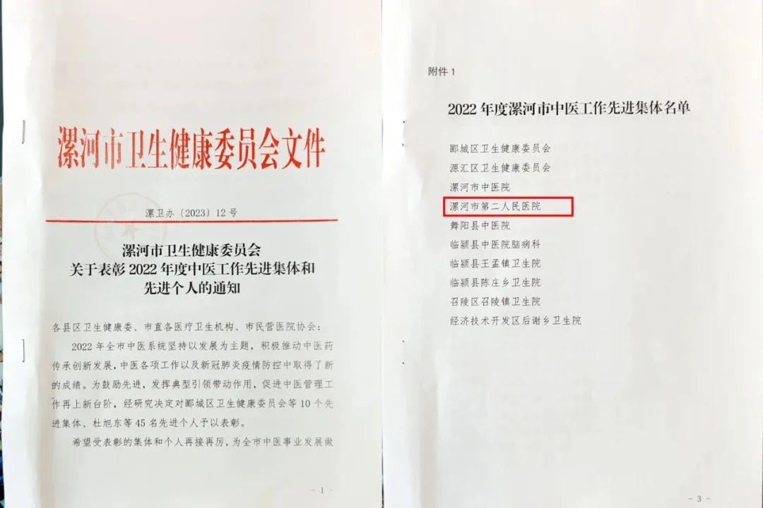 3月2日,市二院被市衛(wèi)健委授予2022年度漯河市中醫(yī)工作先進(jìn)集體榮譽(yù)稱號。