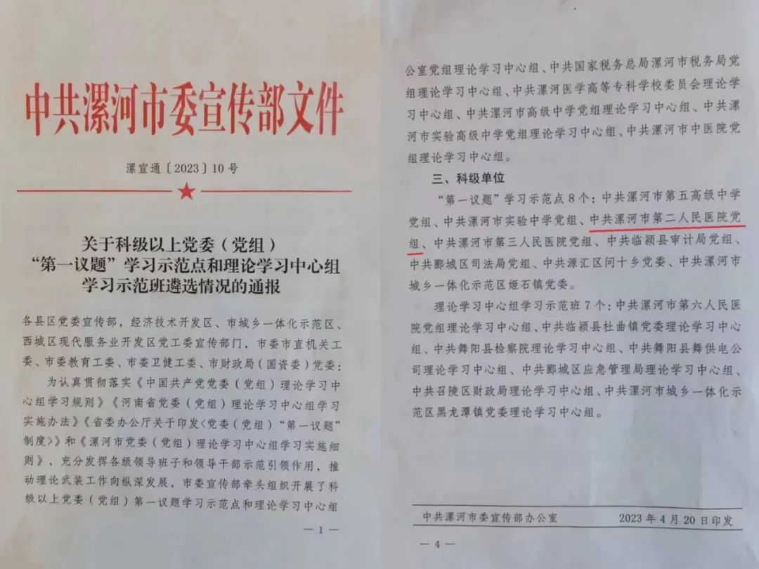 4月26日,市二院黨委被市委宣傳部確定為“第一議題”學(xué)習(xí)示范點稱號。