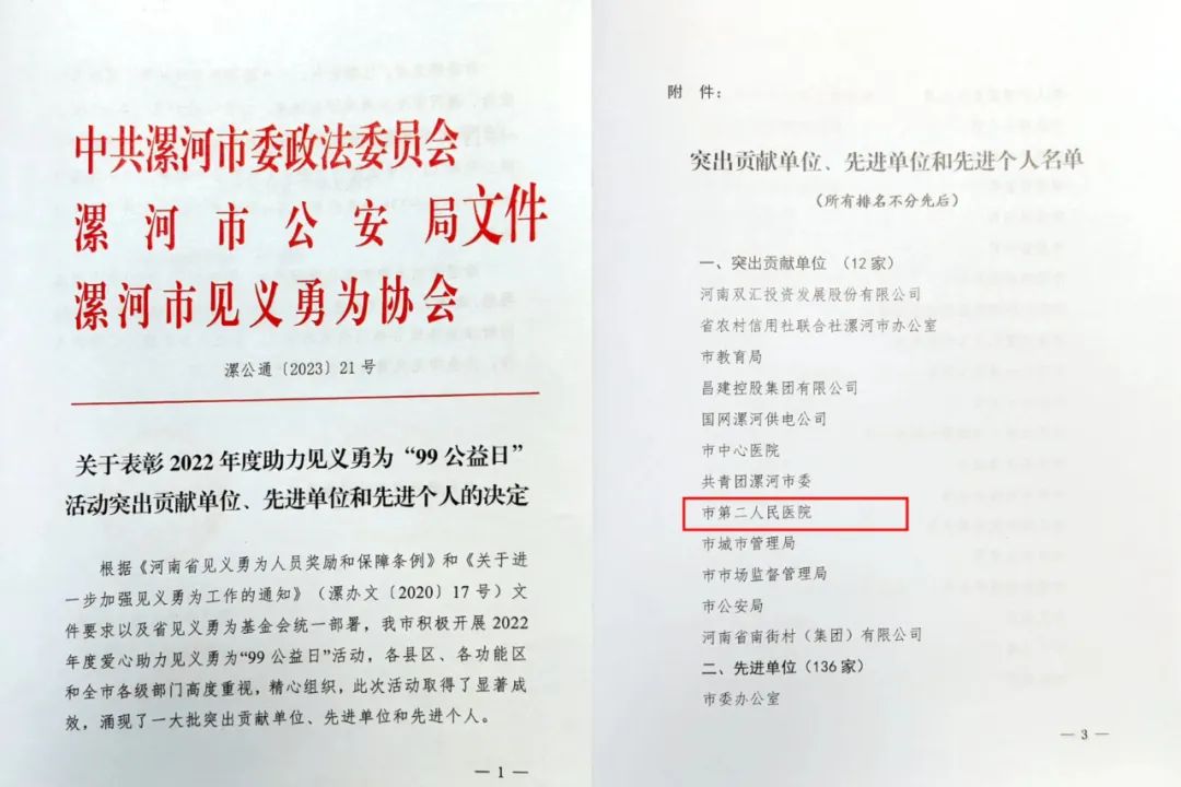 3月29日上午,漯河市見義勇為工作暨“99公益日”表彰會議召開,市二院被授予助力見義勇為“99公益日”活動“突出貢獻(xiàn)單位”。
