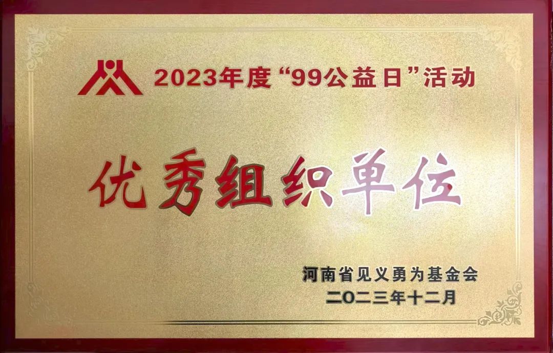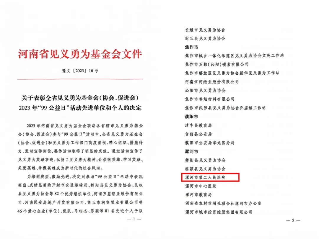 近日,市二院被河南省見義勇為基金會授予全省2023年“99公益日”活動先進單位榮譽稱號。