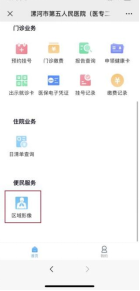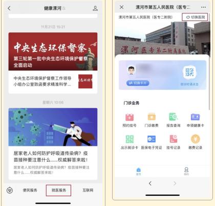 1.關(guān)注“健康漯河”微信公眾號或微信小程序,選擇“就醫(yī)服務(wù)”,切換到漯河市第五人民醫(yī)院(醫(yī)專二附院)