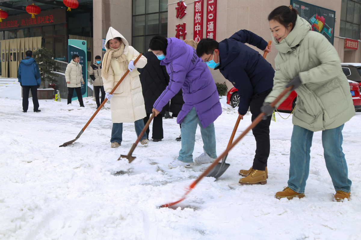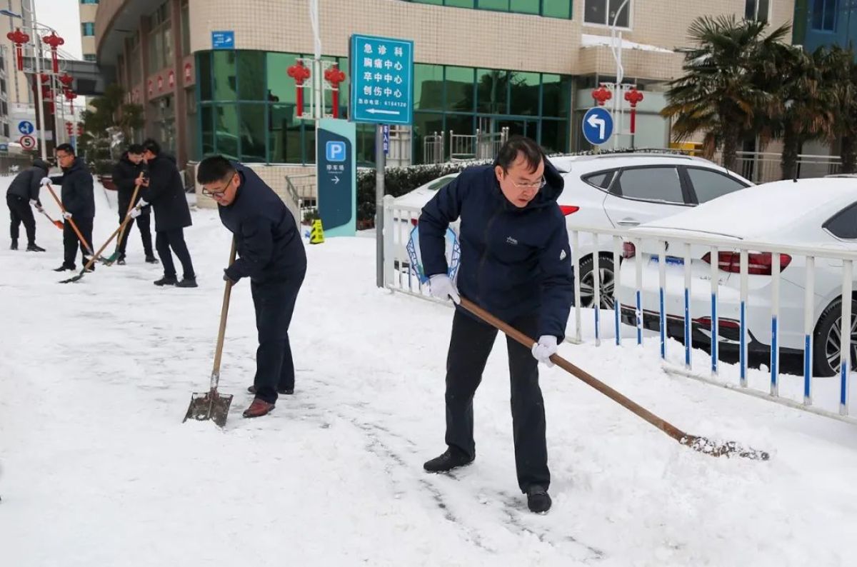 醫(yī)院領(lǐng)導(dǎo)身先士卒,干部職工們干勁十足。大家手持鐵鍬、掃帚等工具,敲冰層、掃積雪,迅速將急診、門診樓、120通道等重點(diǎn)道路上的積雪和暗冰清除干凈,為生命通道掃清了障礙。