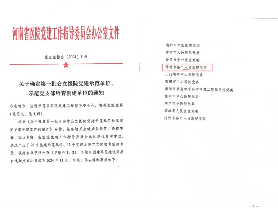 近日,河南省醫(yī)院黨建工作指導(dǎo)委員會(huì)下發(fā)《關(guān)于確定第一批公立醫(yī)院黨建示范單位、示范黨支部培育創(chuàng)建單位的通知》,市二院黨委被確定為河南省公立醫(yī)院黨建示范單位(培育創(chuàng)建單位),是全省28個(gè)黨建示范單位之一、漯河地區(qū)唯一。