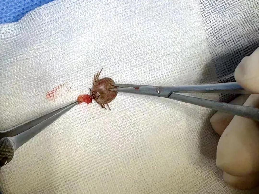 經(jīng)介紹慕名來到市二院顯微外科,副主任醫(yī)師王占磊詳細(xì)了解病情后,診斷其為蜱蟲叮咬,而且蜱蟲頭部已經(jīng)鉆進(jìn)皮膚。隨后,在顯微鏡下終將蟲子完整取出,經(jīng)細(xì)查蟲子肢體完整,病人滿意而歸。