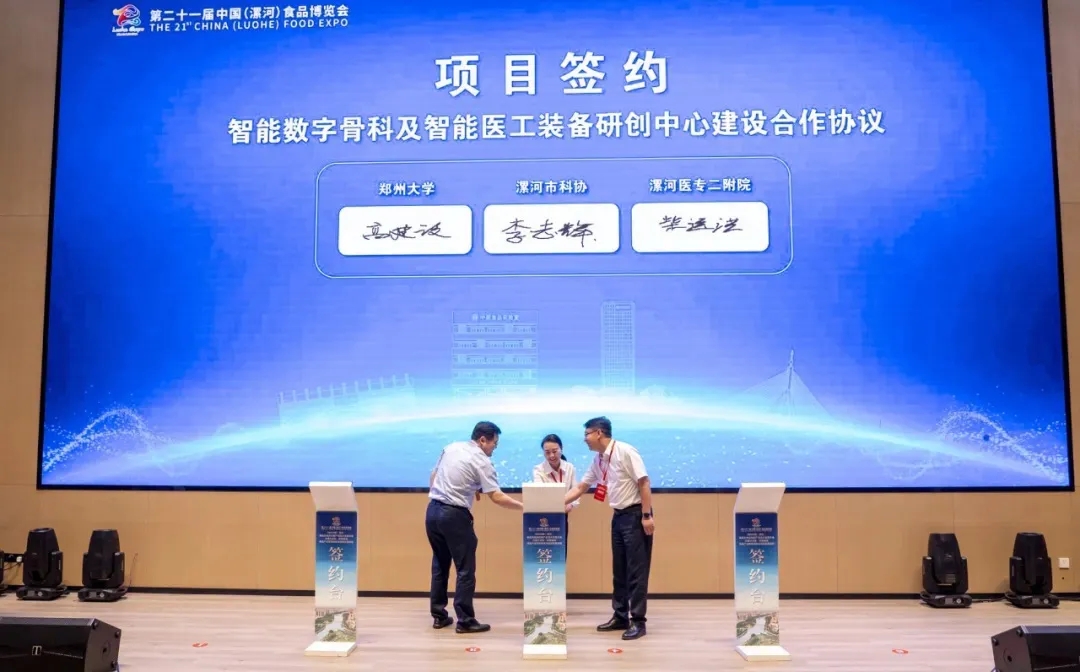 開(kāi)幕式現(xiàn)場(chǎng),漯河市骨科醫(yī)院(漯河醫(yī)專二附院、漯河市立醫(yī)院)黨委書記柴運(yùn)洪與鄭州大學(xué)機(jī)械與動(dòng)力工程學(xué)院院長(zhǎng)、教授高建設(shè),漯河市科協(xié)黨組書記、主席李志輝簽訂了智能數(shù)字骨科及智能醫(yī)工裝備研創(chuàng)中心建設(shè)合作協(xié)議。