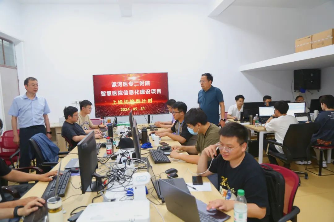 5月31日晚,院長(zhǎng)李奎、副院長(zhǎng)曹鵬克一行深入信息科、藥房、各臨床科室和醫(yī)技科室檢查新系統(tǒng)切換前的各項(xiàng)工作,一切準(zhǔn)備就緒。6月1日零點(diǎn),新系統(tǒng)正式切換上線。按照預(yù)定安排,軟件工程師們和信息科工作人員全部下沉到各科室工作一線,及時(shí)解決系統(tǒng)運(yùn)行中出現(xiàn)的問題,有序地對(duì)全業(yè)務(wù)流程進(jìn)行保障。6月1日早8點(diǎn),新系統(tǒng)第一張電子入院證辦理成功!患者在病區(qū)順利辦理入住。隨后,來自新系統(tǒng)的第一張掛號(hào)單、第一張檢查、檢驗(yàn)申請(qǐng)單、第一張?zhí)幏絾我蚕嗬^開出?;颊咭岔樌瓿蓲焯?hào)、檢查、取藥等就醫(yī)流程。在系統(tǒng)工程師的辛勤工作和各科室工作人員的相互配合下,新系統(tǒng)運(yùn)行平穩(wěn),各科室醫(yī)療業(yè)務(wù)工作開展順利,新信息系統(tǒng)切換工作取得圓滿成功。