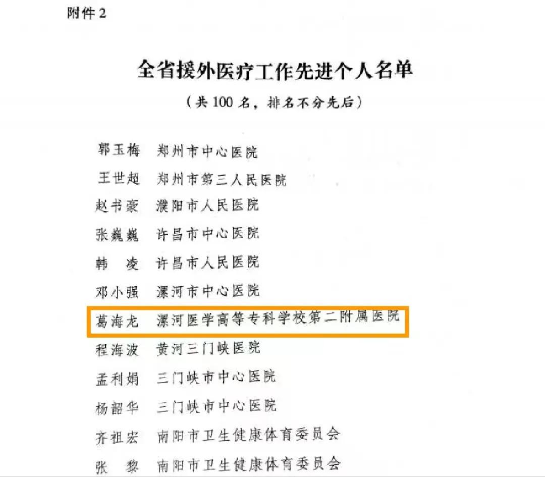在紀(jì)念河南省承派援外醫(yī)療隊50周年的重要時刻,為表揚先進(jìn)、樹立楷模,省衛(wèi)生健康委隆重舉行紀(jì)念大會,對包括援埃塞俄比亞中國醫(yī)療隊群體在內(nèi)的47個優(yōu)秀集體以及100名杰出個人進(jìn)行了通報表揚。其中,漯河市骨科醫(yī)院(漯河醫(yī)專二附院、漯河市立醫(yī)院)葛海龍榮獲全省援外醫(yī)療工作先進(jìn)個人!