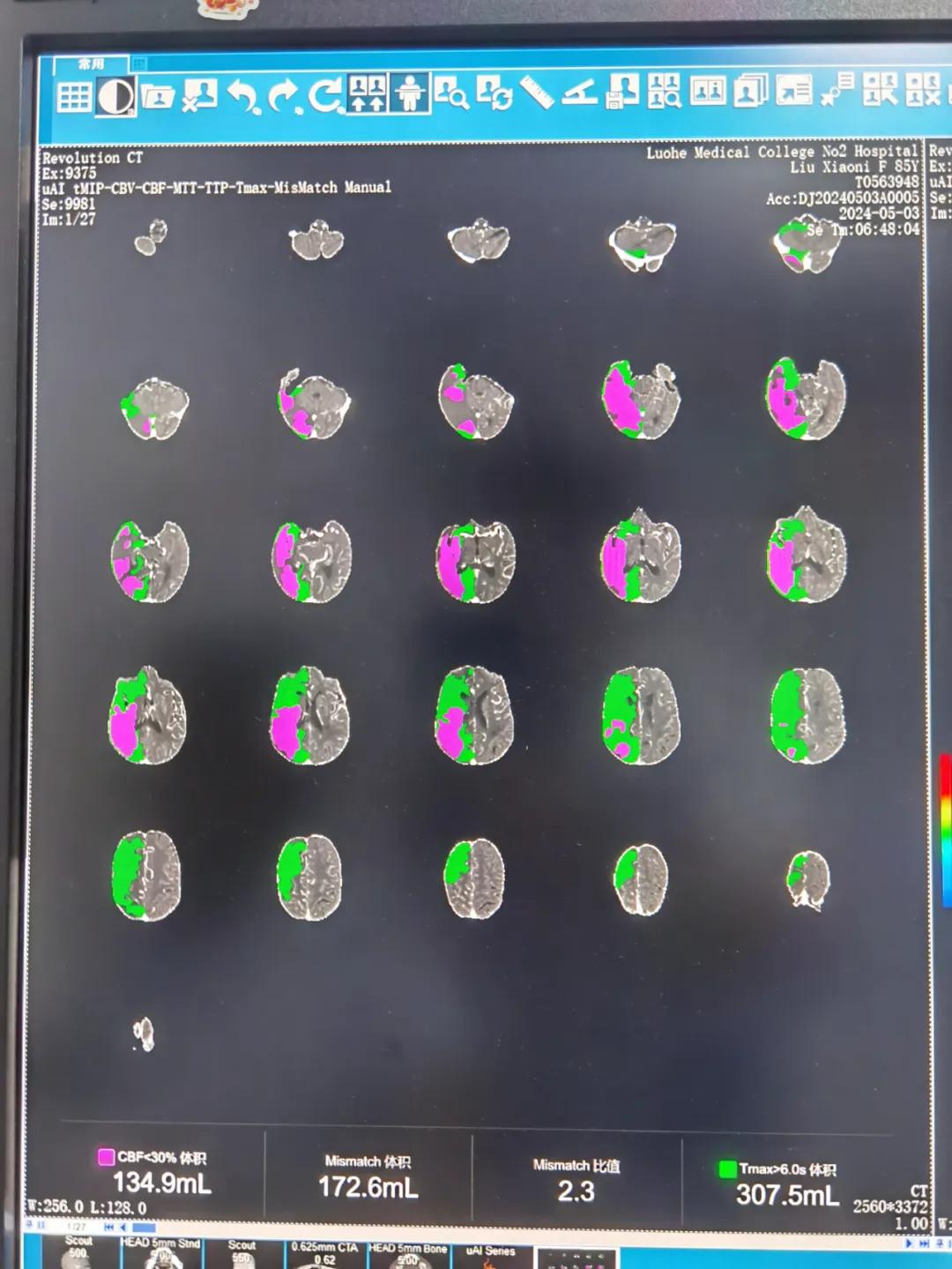 急診多模式頭顱CT人工智能評估手術(shù)患者:紅色區(qū)域代表已缺血壞死腦組織,綠色部分代表可挽救的腦組織。