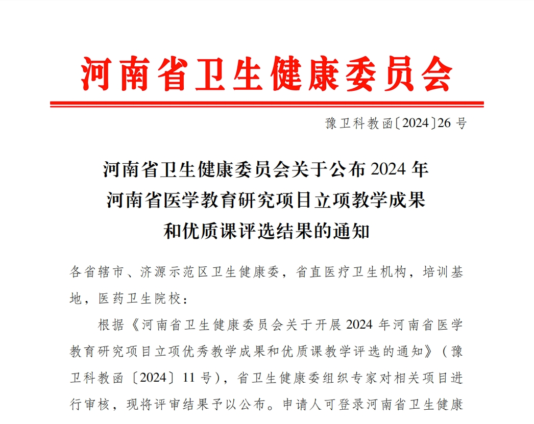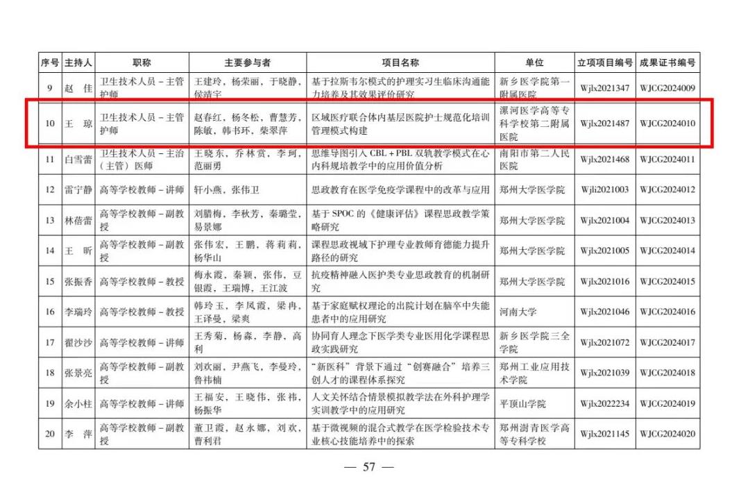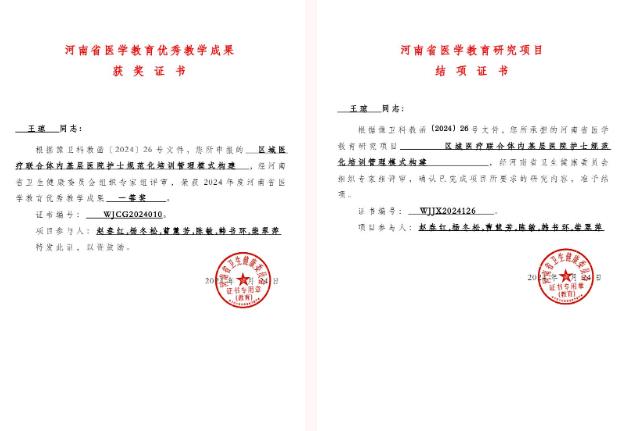近日,河南省衛(wèi)生健康委員會下發(fā)了《關于公布2024年河南省醫(yī)學教育研究項目立項教學成果和優(yōu)質課評選結果的通知》,由漯河市骨科醫(yī)院(漯河醫(yī)專二附院、漯河市立醫(yī)院)王瓊、趙春紅、楊冬松、曹慧芳、陳敏、韓書環(huán)、柴翠萍團隊完成的《區(qū)域醫(yī)療聯(lián)合體內基層醫(yī)院護士規(guī)范化培訓管理模式構建》項目完成結項,被授予2024年河南省醫(yī)學教育優(yōu)秀教學成果一等獎。