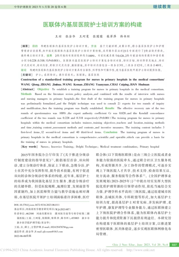 漯河醫(yī)專二附院(漯河市骨科醫(yī)院、漯河市立醫(yī)院)作為國家三級綜合醫(yī)院,高度重視醫(yī)聯(lián)體建設,自2019年成立醫(yī)聯(lián)體組織以來,作為牽頭單位已簽署了30余家成員單位,近年來不斷探索基層醫(yī)院護士來院培訓學習方案,2021年我院申報獲批河南省醫(yī)學教育研究項目1項,項目名稱為“區(qū)域醫(yī)療聯(lián)合體內基層醫(yī)院護士規(guī)范化培訓管理模式的構建”,項目團隊成員經(jīng)過文獻檢索、調查研究、專家函詢等形式構建了“基于醫(yī)聯(lián)體的基層醫(yī)院護士培訓方案”,該培訓方案具有可信性、可行性和可操作性,內容全面,有助于提高基層護士專業(yè)服務能力的提升,被中文核心期刊中華護理教育雜志錄用并發(fā)表。