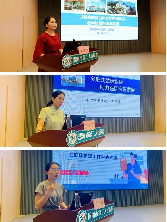 學(xué)術(shù)交流會上,來自全市各級醫(yī)療機構(gòu)的護理健康教育專家們齊聚一堂,結(jié)合自身的實踐經(jīng)驗和研究成果,共同探討護理健康教育的新理念、新方法、新技術(shù)。市中心醫(yī)院護理部副主任劉素紅講解了《以健康教育為中心的護理實習(xí)教學(xué)體系構(gòu)建與實施》,分享醫(yī)院在護理實習(xí)教學(xué)中以健康教育為中心開展帶教的亮點、實踐經(jīng)驗和對未來的展望;市中醫(yī)院呼吸消化科護士長王艷芳講解了《多形式健康教育助力醫(yī)院宣傳發(fā)展》,分享醫(yī)院開展健康教育項目的具體實施和取得的成效;市醫(yī)專二附院中醫(yī)骨傷科護士長王瓊講解了《健康宣教在臨床護理工作中的應(yīng)用》,通過了解健康教育的方式方法談到如何把健康教育落到實處;市六院護理部副主任崔臻講解了《創(chuàng)新理念與健康教育》,通過對傳統(tǒng)健康教育模式的反思談到創(chuàng)新理念在健康教育中的應(yīng)用;市二院護理部主任高凱霞講解了《家庭病床醫(yī)護團隊如何進行健康教育實踐活動》,通過案例展示如何開展健康教育;市二院普外科護士長王書霞、神經(jīng)內(nèi)科護士長徐曉爽分別講解了《腫瘤患者吃-動-心平衡健康管理》《護理健康教育的發(fā)展與臨床實踐》,運用實例、典故等強調(diào)健康教育的必要性和重要性,展示了臨床工作中取得的成果。