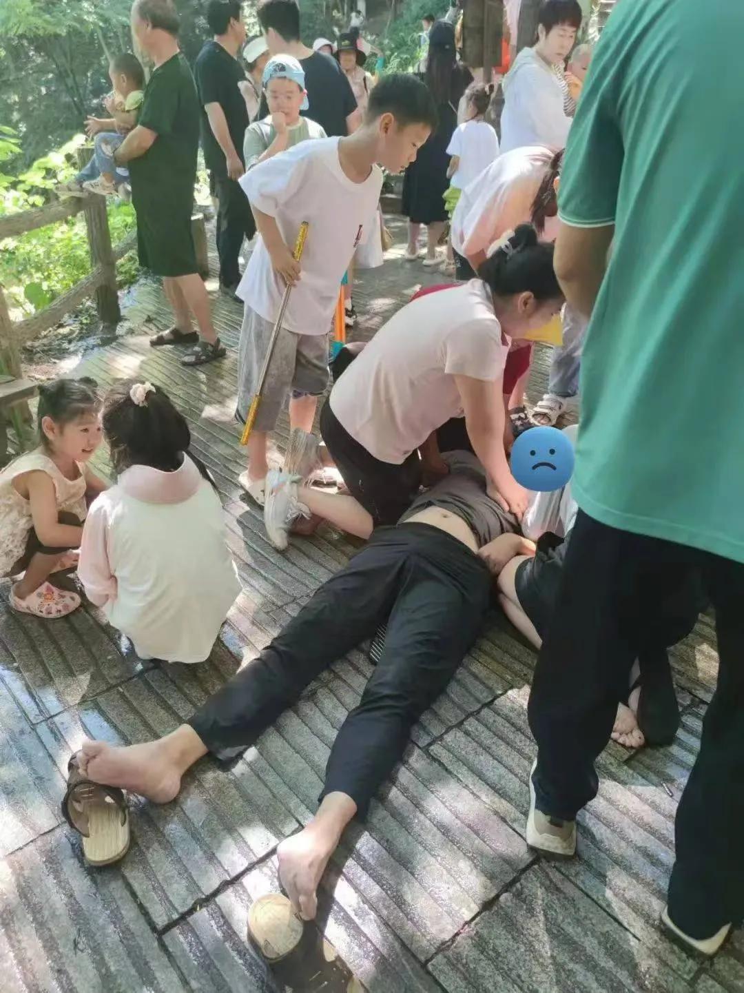 8月13日,王美娜和家人到洛陽(yáng)重渡溝游玩。因?yàn)橹匕Y醫(yī)學(xué)科工作的特殊性,王美娜很少和家人外出,孩子們都很開(kāi)心。上午11時(shí)左右,在水簾仙宮瀑布旁,王美娜突然看到不遠(yuǎn)處亂作一團(tuán):有游客突然倒地,家人慌了神,其他游客也不知道如何處理,有幾個(gè)游客大聲疾呼。王美娜在重癥醫(yī)學(xué)科工作多年,各種突發(fā)情況都經(jīng)常遇見(jiàn),但是在院外還是第一次遇到,完全是職業(yè)本能促使她下意識(shí)作出反應(yīng),立刻奔過(guò)去,并亮明身份:我是急救護(hù)士。大家立刻有了主心骨,人群安靜下來(lái)。