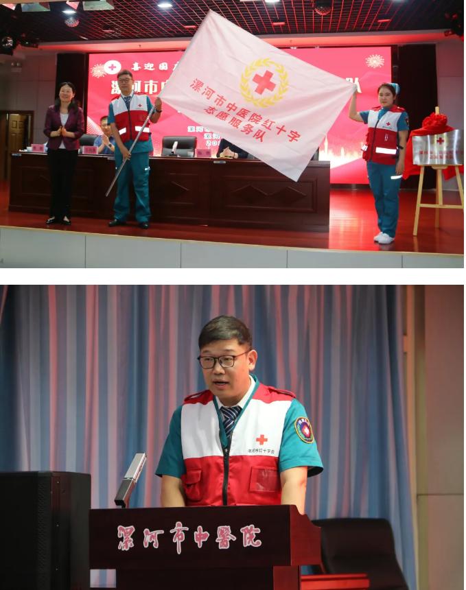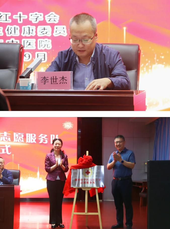 李世杰宣讀《漯河市紅十字會(huì)關(guān)于同意成立漯河市中醫(yī)院紅十字志愿服務(wù)隊(duì)的批復(fù)》文件。孫潁華、王向良為漯河市中醫(yī)院紅十字志愿服務(wù)隊(duì)揭牌。孫潁華向漯河市中醫(yī)院紅十字志愿服務(wù)隊(duì)授旗。漯河市中醫(yī)院紅十字志愿服務(wù)隊(duì)代表李強(qiáng)進(jìn)行表態(tài)發(fā)言并作出承諾,將充分發(fā)揮紅十字志愿者的優(yōu)勢(shì),為更多需要幫助的人提供醫(yī)療援助和志愿服務(wù)。