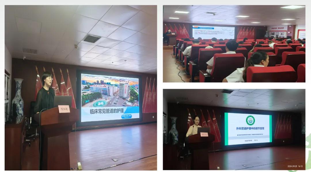 漯河市骨科醫(yī)院管道護理學(xué)組組長侯紅艷護士長通過PPT培訓(xùn)的方式對各類管道的固定方法、固定流程,標(biāo)識使用進行了詳細(xì)的講解,護士們加深了對管道規(guī)范固定重要性的認(rèn)識,對規(guī)范臨床管道護理工作起到了良好的指導(dǎo)作用。婦產(chǎn)科護士長譚少允針對《外科管道護理中的細(xì)節(jié)管理》做了詳盡的說明??祻?fù)醫(yī)學(xué)科護士長田智慧分享了《血管導(dǎo)管相關(guān)感染預(yù)防與控制指南解讀》,預(yù)防血管內(nèi)導(dǎo)管相關(guān)血流感染的原因進行分析,并采取相關(guān)舉措后在臨床中獲取的成效和學(xué)員們分享經(jīng)驗。
