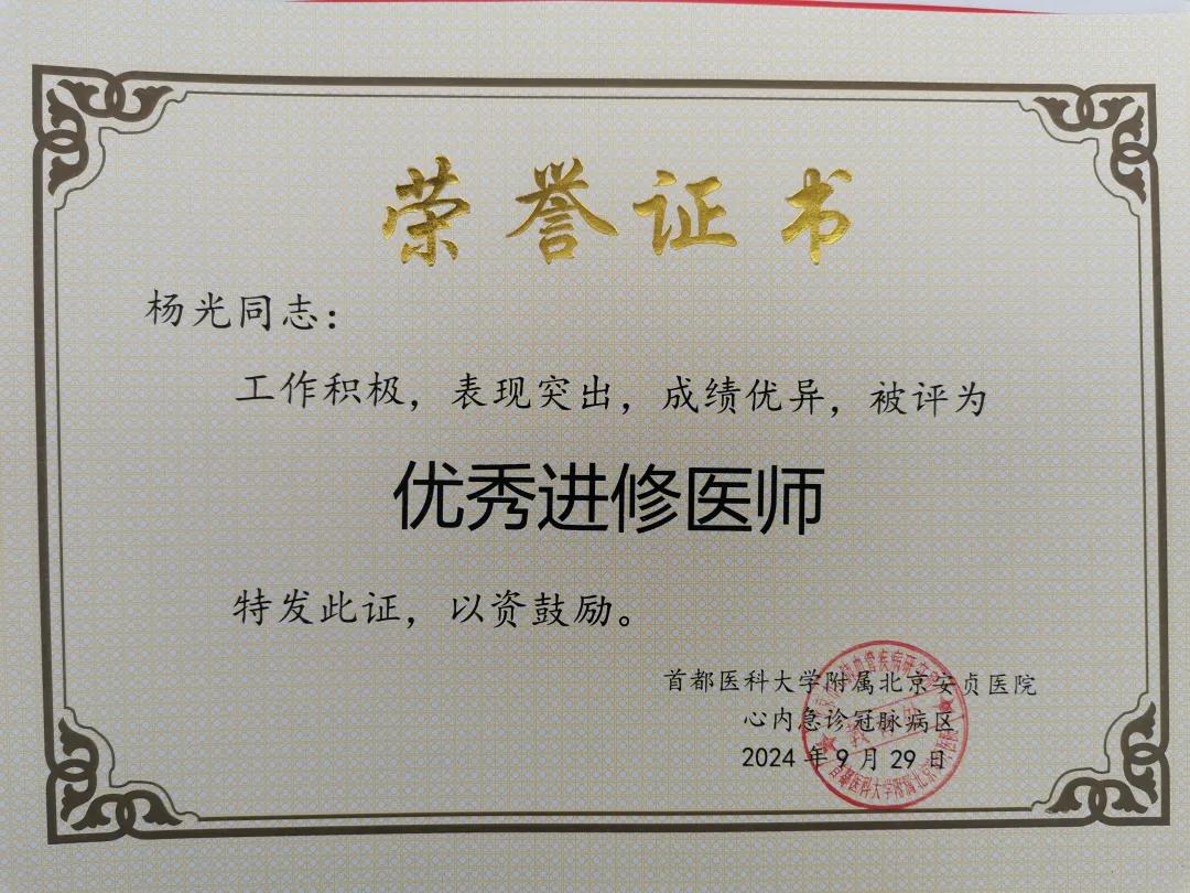 近日,市二院心血管內(nèi)科主治醫(yī)師楊光在首都醫(yī)科大學(xué)附屬北京安貞醫(yī)院完成為期一年的進(jìn)修學(xué)習(xí),現(xiàn)順利結(jié)業(yè)、學(xué)成歸來,因在進(jìn)修期間表現(xiàn)優(yōu)異,被評為北京安貞醫(yī)院“優(yōu)秀進(jìn)修醫(yī)師”榮譽稱號,不僅為醫(yī)院全體青年醫(yī)師樹立了榜樣,同時也給醫(yī)院心內(nèi)科專業(yè)發(fā)展注入新的活力,將所學(xué)轉(zhuǎn)化為生產(chǎn)力,把新知識、新技術(shù)傳播開來,讓更多患者受益。