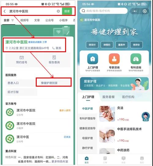 方法2:微信公眾號搜索“漯河市中醫(yī)院”,關(guān)注公眾號→點擊進(jìn)入“豫健護(hù)理到家”平臺