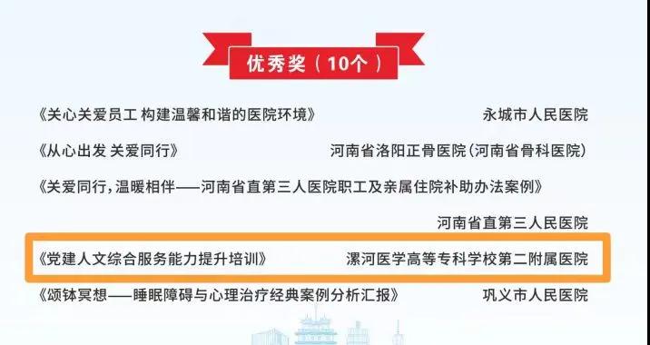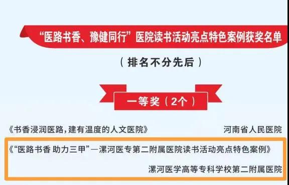 大會(huì)通報(bào)了系列活動(dòng)優(yōu)秀入圍作品名單,其中,漯河市骨科醫(yī)院(漯河醫(yī)專二附院、漯河市立醫(yī)院)報(bào)送的作品《醫(yī)路書香助力三甲》榮獲“醫(yī)路書香、豫健同行”醫(yī)院讀書活動(dòng)亮點(diǎn)特色案例一等獎(jiǎng);《大醫(yī)吳廣良》榮獲“身邊的榜樣”敘事醫(yī)學(xué)故事一等獎(jiǎng);《黨建引領(lǐng)人文綜合服務(wù)能力提升》榮獲“員工關(guān)愛計(jì)劃”優(yōu)秀案例!