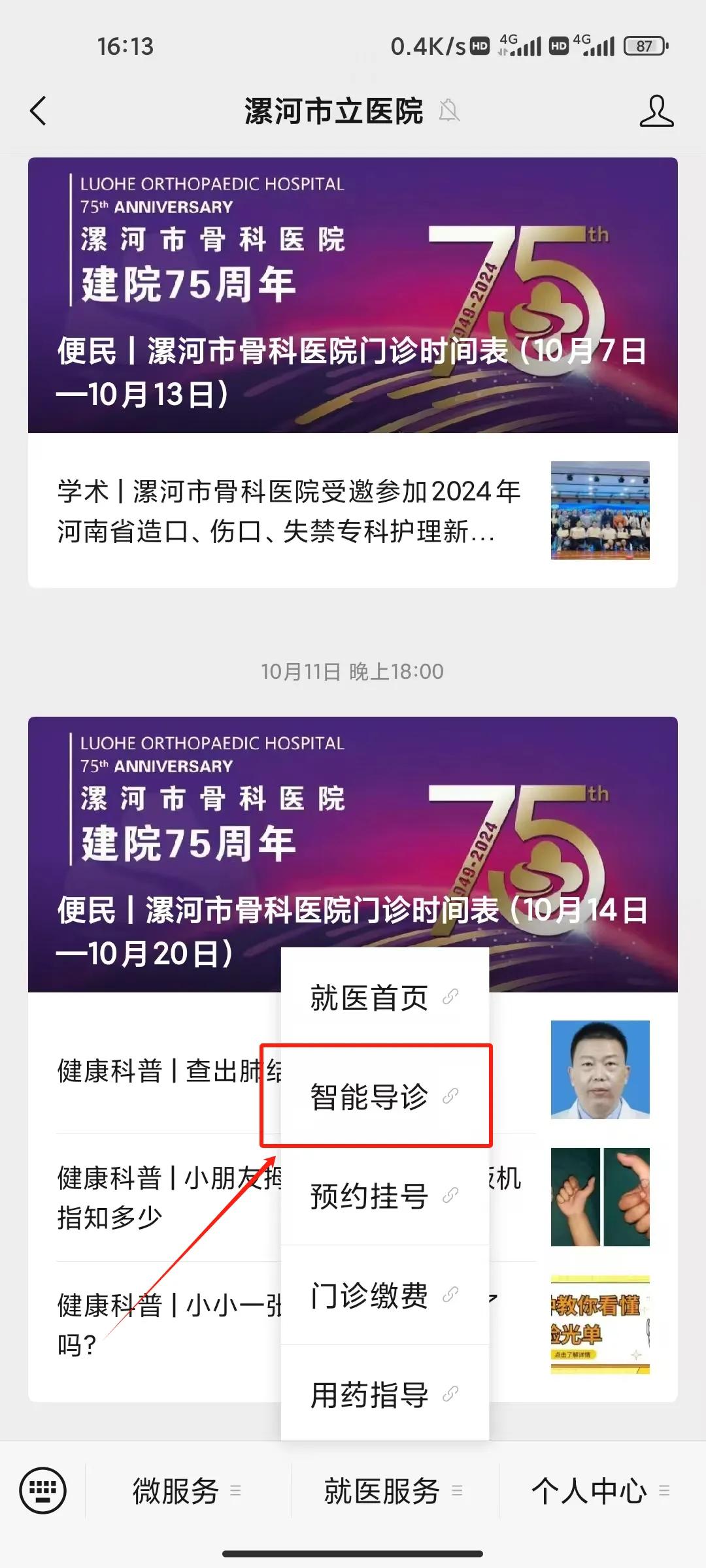 (1)關(guān)注微信公眾號(hào)點(diǎn)擊就醫(yī)首頁(yè),進(jìn)入公眾號(hào)主頁(yè),點(diǎn)擊智能導(dǎo)診;