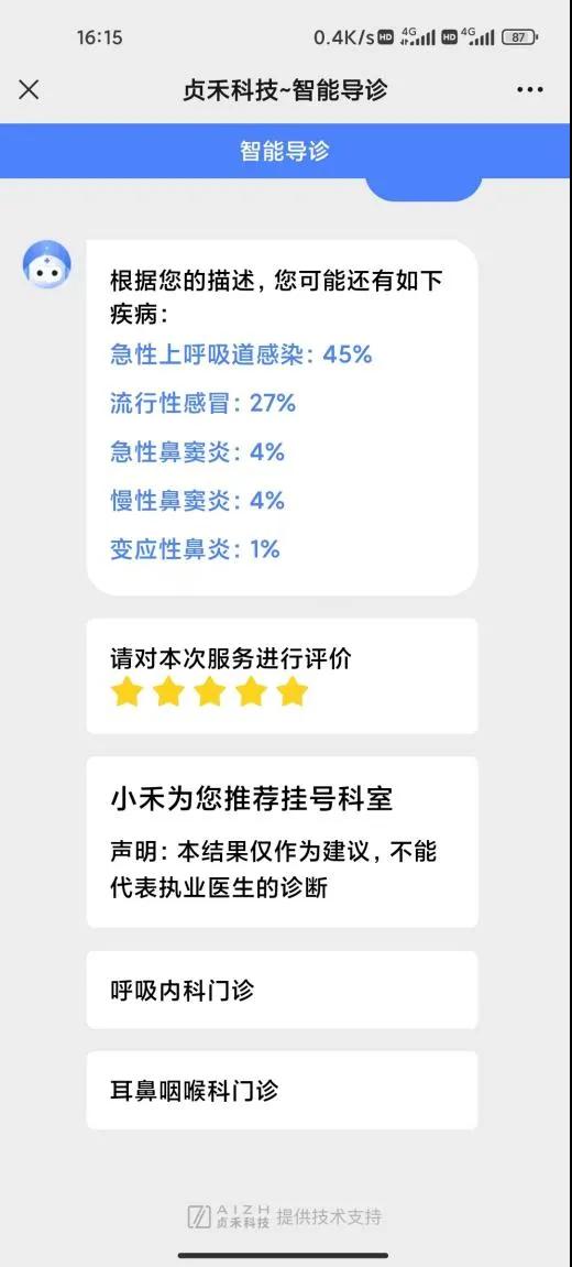 為了方便群眾就醫(yī),解決患者就醫(yī)過(guò)程中“知癥不知病”、“知病不知科”的問(wèn)題,“漯河市立醫(yī)院”微信服務(wù)號(hào)推出智能導(dǎo)診功能,根據(jù)患者病情描述、給出分診建議、推薦相關(guān)科室、找到合適醫(yī)生,不但優(yōu)化了患者就醫(yī)流程,而且減少人工分診工作量、避免人員聚集。