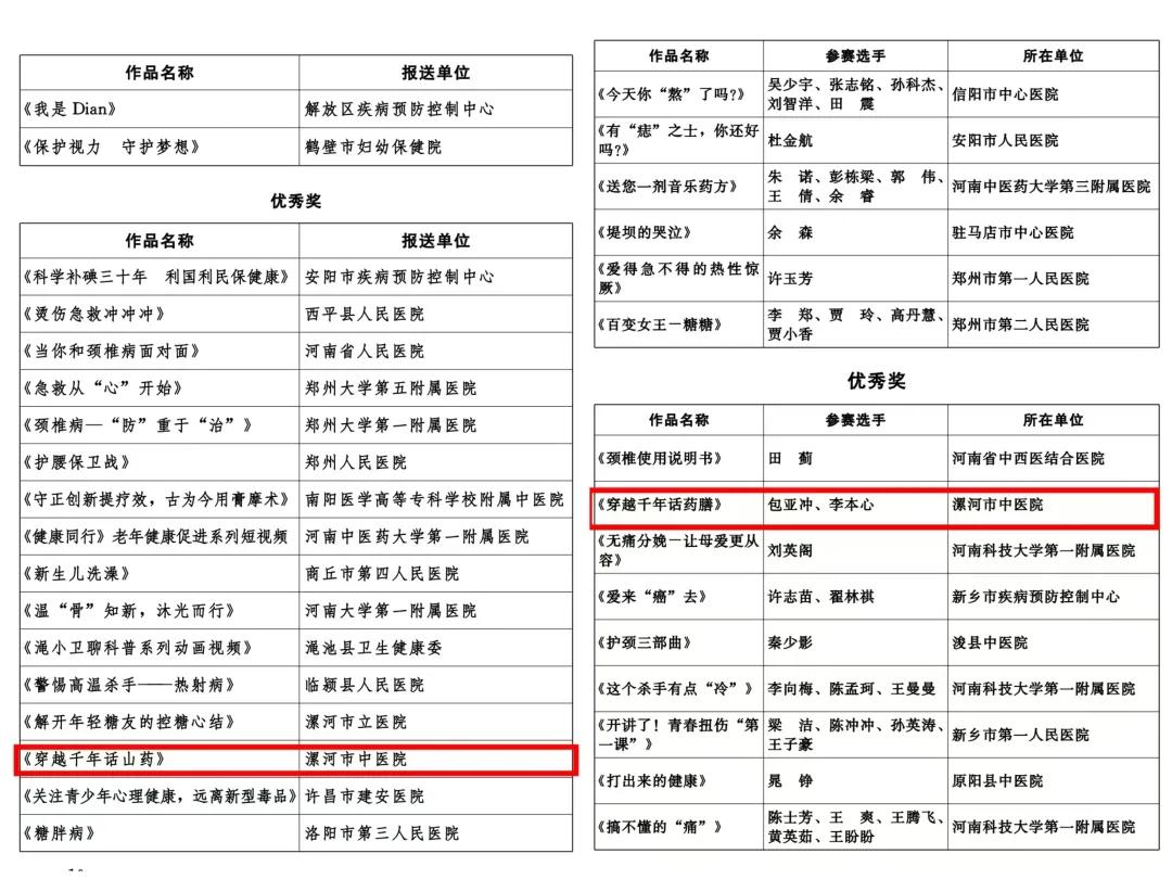 自3月28日以來,經(jīng)過初賽、分主題決賽、總決賽的激烈角逐,漯河市中醫(yī)院手術(shù)室主管護(hù)師包亞沖和外一科主治中醫(yī)師李本心共同創(chuàng)作的科普作品《穿越千年話藥膳》榮獲第六屆河南省健康科普技能大賽表演類優(yōu)秀獎(jiǎng),包亞沖創(chuàng)作的《穿越千年話山藥》榮獲第六屆河南省健康科普技能大賽科普作品視頻類優(yōu)秀獎(jiǎng)。