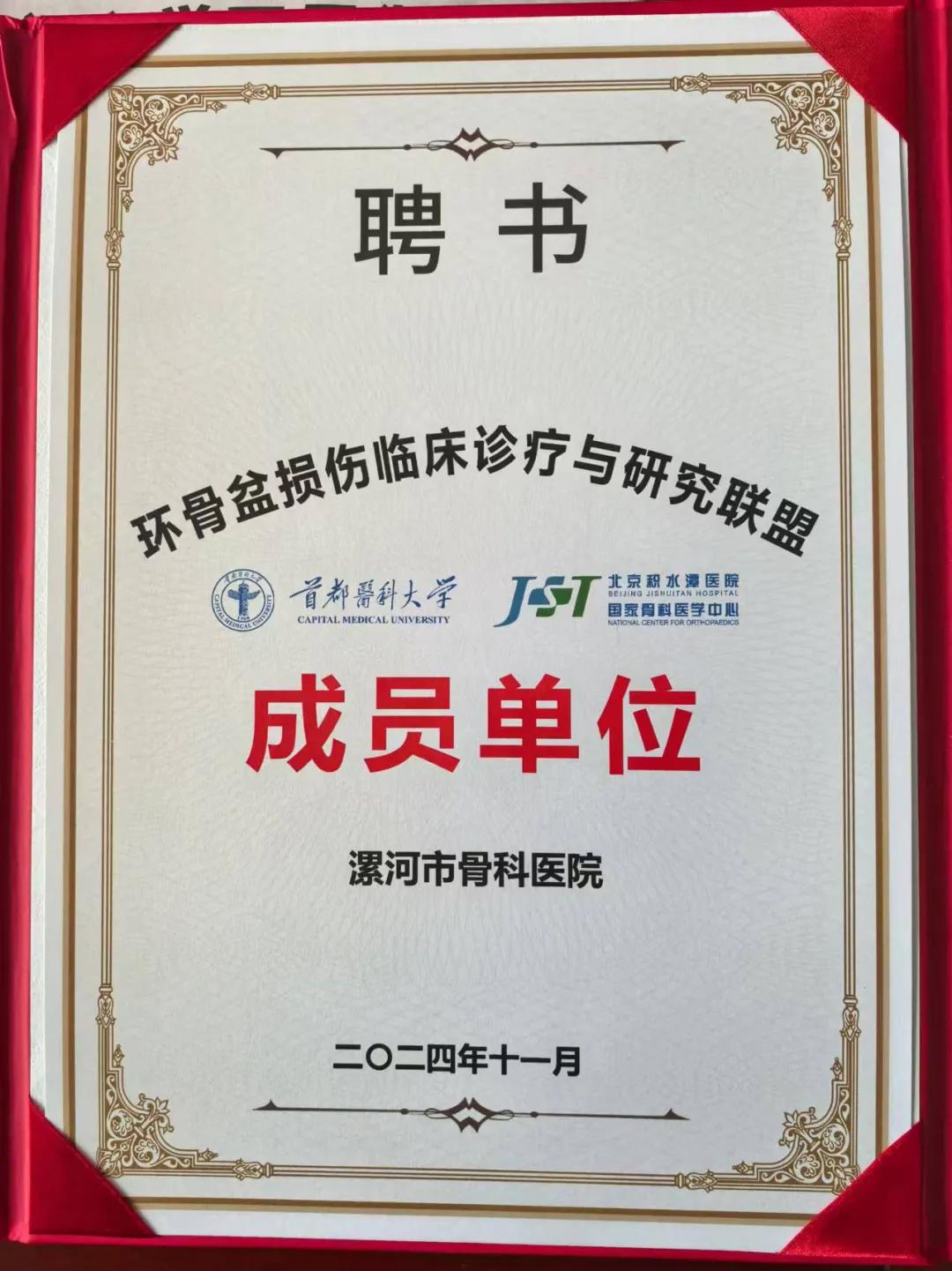 近日,北京積水潭醫(yī)院(國家骨科醫(yī)學(xué)中心)骨科??坡?lián)盟——環(huán)骨盆損傷臨床診療與研究分聯(lián)盟成立大會(huì)在北京舉行。漯河市骨科醫(yī)院(漯河醫(yī)專二附院、漯河市立醫(yī)院)作為首批成員單位應(yīng)邀參加此次大會(huì)。