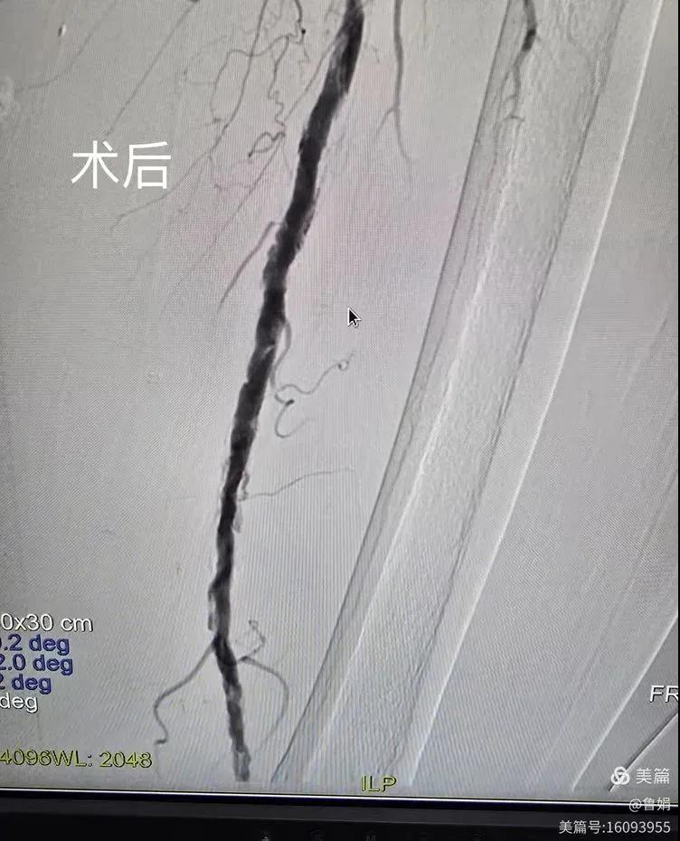 據(jù)悉,該患者,女,73歲,下肢動(dòng)脈硬化閉塞癥,“以靜息痛,間歇性跛行”入院,CTA評(píng)估:股淺動(dòng)脈,腘動(dòng)脈間斷性多段重度狹窄,外二科血管外科團(tuán)隊(duì)根據(jù)患者病情,結(jié)合檢查結(jié)果,經(jīng)過科室會(huì)診后,決定對(duì)該病人行介入治療。手術(shù)由周創(chuàng)業(yè)副主任與北大一院血管外科專家郭宏杰教授聯(lián)合開展,對(duì)股淺動(dòng)脈,腘動(dòng)脈重度閉塞段行血管開通+藥涂球囊擴(kuò)張成形,術(shù)后狹窄明顯緩解,血流恢復(fù)!