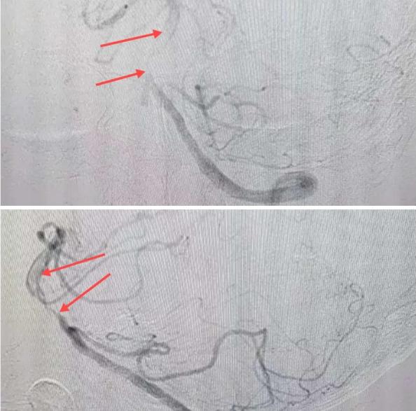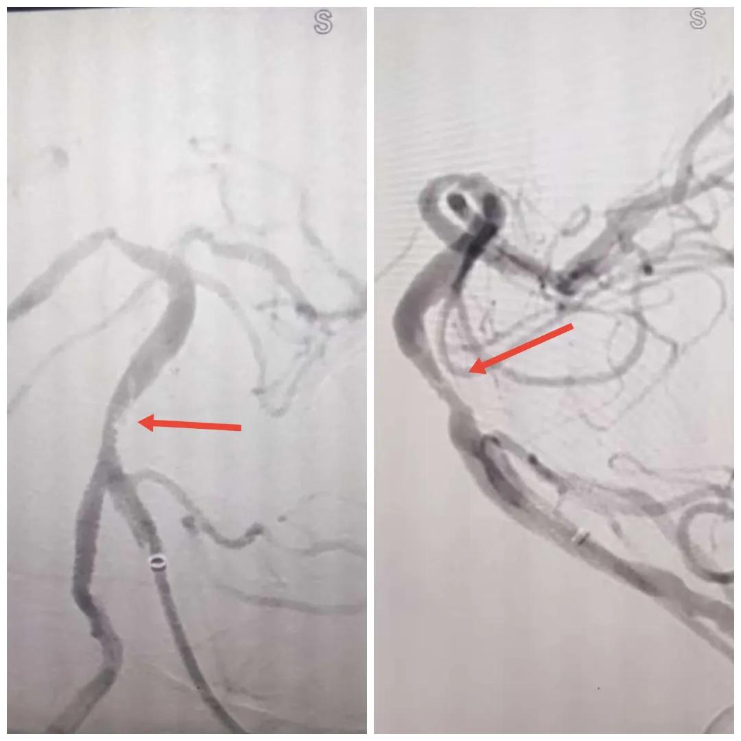 在經(jīng)造影后,主刀醫(yī)生腦一科副主任楊慶堂發(fā)現(xiàn)患者基底動脈下段重度狹窄且狹窄段以遠有大負荷血栓,其狹窄處考慮為動脈夾層,手術(shù)難度及風險較大。楊慶堂副主任在彭壯副主任醫(yī)師的協(xié)助下運用spaceman(太空人)技術(shù),中間導(dǎo)管抵近血栓抽吸配合支架拉栓,成功開通血管。再次造影可見基底動脈管腔明顯增寬,遠端血管顯影良好,且等待20分鐘后造影仍顯示血流通暢。楊慶堂副主任考慮到本次手術(shù)時間不宜過長,現(xiàn)患者基底動脈及分支前向血流維持良好,給予其抗栓藥物應(yīng)用后結(jié)束手術(shù),并建議患者3個月后復(fù)查造影,明確其基底動脈夾層情況。