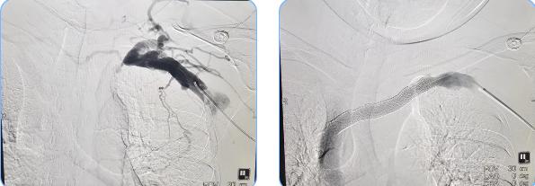 (左)術(shù)前左無名靜脈閉塞;  (右)術(shù)后左無名靜脈回流通暢