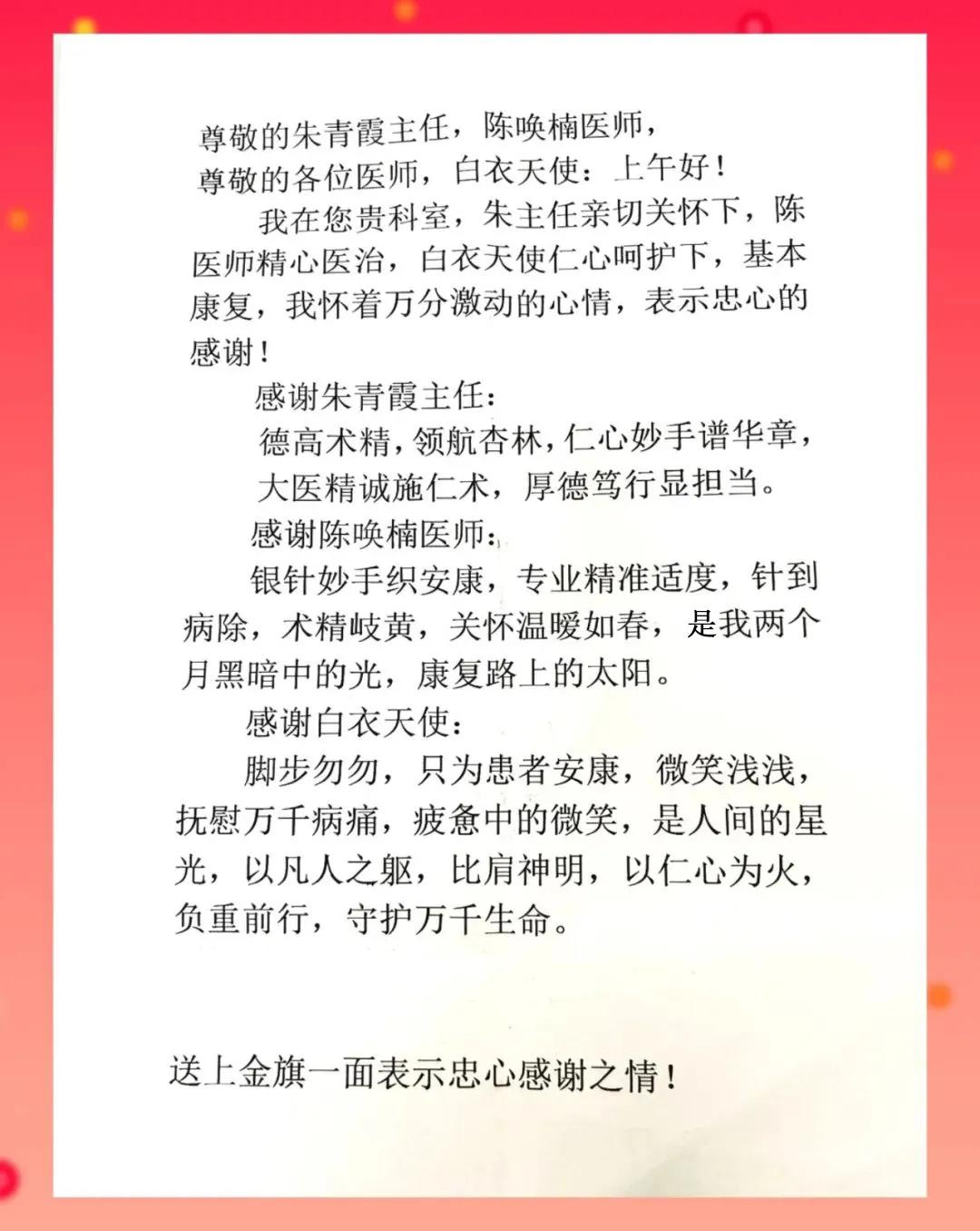 近日,市二院中醫(yī)針灸科門診醫(yī)護(hù)人員一如既往地忙碌著。突然,走廊里傳來一陣熱烈的掌聲,原來,74歲的田大叔在家人陪伴下,手捧錦旗和感謝信來到醫(yī)院。田大叔激動(dòng)地展開感謝信,聲情并茂地朗讀起來,說到動(dòng)情處更是眼含熱淚,字里行間飽含著對(duì)中醫(yī)針灸科主任朱青霞的誠(chéng)摯謝意和對(duì)整個(gè)醫(yī)護(hù)團(tuán)隊(duì)精湛醫(yī)術(shù)與暖心服務(wù)的認(rèn)可與贊美。讀完,田大叔深深地鞠躬致謝,這一躬身,更是見證中醫(yī)針灸科‘破冰’三十年病痛,醫(yī)患同心最好的詮釋。