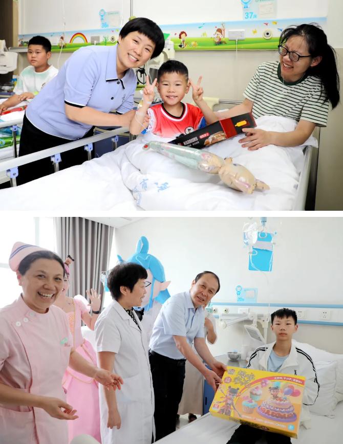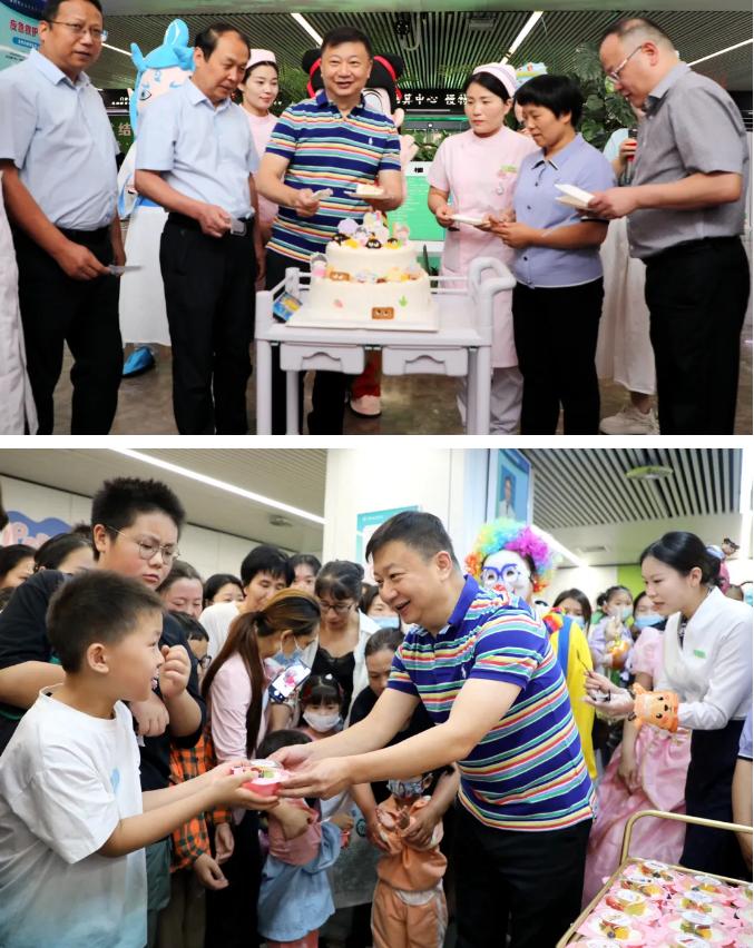 在孩子們期待的目光中,黨委書記魏松、院長胡海英攜班子成員和兒科專家們?yōu)楹⒆觽円黄鹎邢虏⒎窒砉?jié)日蛋糕,“愿寶貝們心里有愛,眼里有光,永遠做自己的小太陽!”真摯的祝福隨蛋糕甜香漫溢全場。