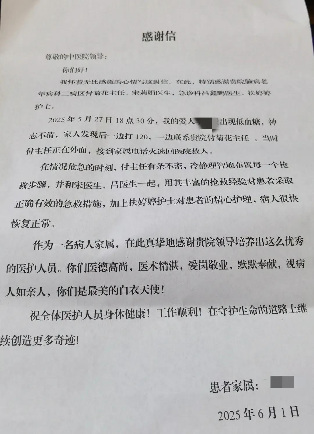 據(jù)了解,該女士其丈夫患腦血管疾病,曾在市中醫(yī)院腦二科就診,是腦二病區(qū)付菊花主任的病人,后多次到腦二科找付醫(yī)生復(fù)診。5月27日晚,患者病情危急,患者家屬趕忙聯(lián)系付菊花,付菊花當時已下班回家,她接到電話后立即與院急診科和腦二科宋莉娟醫(yī)生聯(lián)系開展相關(guān)救治工作并抓緊到醫(yī)院參與救治,還用“醫(yī)生全年無休守護患者”的暖心話語安慰焦急的患者家屬。急診科的呂鑫鵬、扶婷婷也對患者采取正確有效的急救措施及精心護理,經(jīng)過各科室的精心救治,患者癥狀快速好轉(zhuǎn),病人家屬特送來信表示感謝。