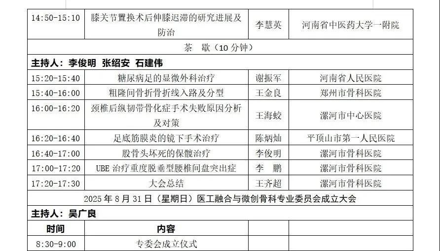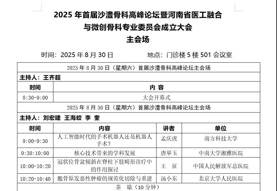 漯河市骨科醫(yī)院: 8月30日-31日,首屆沙澧骨科高峰論壇暨河南省物理醫(yī)學(xué)學(xué)會(huì)醫(yī)工融合與微創(chuàng)骨科專業(yè)委員會(huì)成立大會(huì)誠邀您的蒞臨!