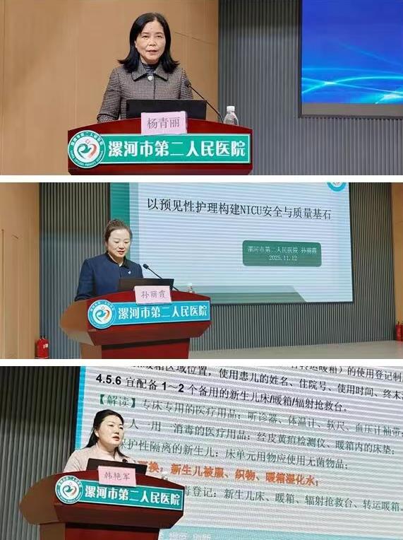 學(xué)術(shù)交流環(huán)節(jié),市中心醫(yī)院NICU護(hù)士長楊青麗以《新生兒低血糖臨床規(guī)范管理專家共識》(2021)為題,系統(tǒng)闡述了新生兒低血糖的“預(yù)防、篩查、干預(yù)、隨訪”四個重點(diǎn);市二院護(hù)理部副主任孫麗霞分享了《以預(yù)見性護(hù)理構(gòu)建NICU安全與質(zhì)量基石》,點(diǎn)明預(yù)見性護(hù)理是NICU生命安全保障的基石,也是質(zhì)量持續(xù)提升的第一道防線;市二院感控辦副主任韓艷軍以《新生兒病區(qū)醫(yī)院感染預(yù)防與控制標(biāo)準(zhǔn)》進(jìn)行了交流,闡明要嚴(yán)守感控標(biāo)準(zhǔn),筑牢安全防線,保障每一位新生兒的健康與安全;市婦幼保健院兒科護(hù)士長鄭文韜以《高危兒靜脈通路的合理選擇》展開,講解了高危兒靜脈通路的選擇,核心在于基于個體評估,實(shí)現(xiàn)安全與療效的最佳平衡;市二院靜療??谱o(hù)士李艷結(jié)合《兒童靜療常見并發(fā)癥的預(yù)防及處理》,提出兒童靜療安全,核心在于以預(yù)防為首;市二院傷口造口??谱o(hù)士馬美華分享了《兒童常見皮膚護(hù)理與管理》,闡述嚴(yán)守預(yù)防底線,踐行精細(xì)照護(hù),是守護(hù)新生兒稚嫩肌膚、避免醫(yī)源性皮膚損傷的根本之道。