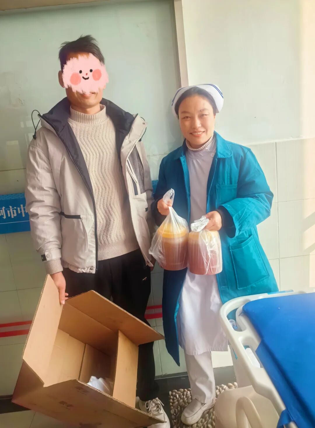 12月11日,患者復查時,把蜂蜜送到同事們手中,他臉上露出了久違的笑容。并對醫(yī)院以及同事們給予的關愛表達了深深的感謝。