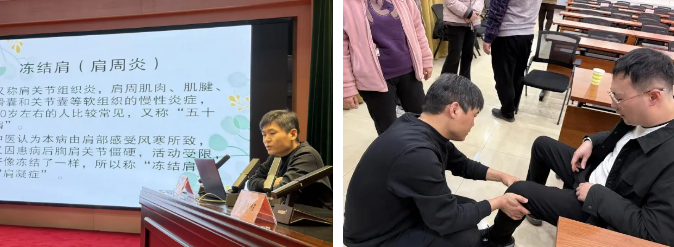 曹愛華主任強(qiáng)調(diào)了卒中防治的重要性,并針對(duì)職場(chǎng)人群常見的健康隱患,詳細(xì)講解了腦卒中的早期識(shí)別方法。同時(shí),分享了高血壓、糖尿病、血脂異常等危險(xiǎn)因素的科學(xué)管控方法,促使大家養(yǎng)成良好的飲食和生活習(xí)慣。宋松根副主任結(jié)合職工工作特點(diǎn),重點(diǎn)講解了冠心病的防治、急性心肌梗死的典型癥狀及急救三步法,并分享了“控血壓、調(diào)血脂、控血糖、適度運(yùn)動(dòng)、堅(jiān)持服藥”的ABCDE健康管理法則。金艷南副主任醫(yī)師則講解了肩周炎常見認(rèn)識(shí)誤區(qū)、多種病因、“疼痛期、僵硬期、緩解期”三階段臨床表現(xiàn)和功能鍛煉的階梯方法,并現(xiàn)場(chǎng)示范了鐘擺運(yùn)動(dòng)、爬墻運(yùn)動(dòng)等簡單易行的預(yù)防鍛煉動(dòng)作,從日常細(xì)節(jié)中守護(hù)關(guān)節(jié)健康。