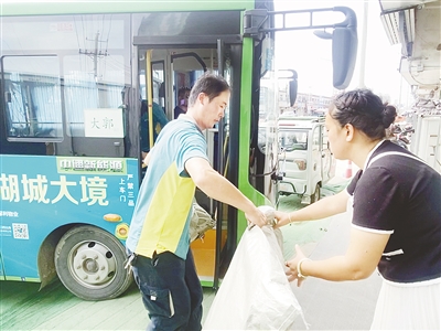 7月27日,在臨潁縣大郭鎮(zhèn)寄遞物流共配中心,工作人員正從一輛臨潁至大郭的公交車上卸快遞。