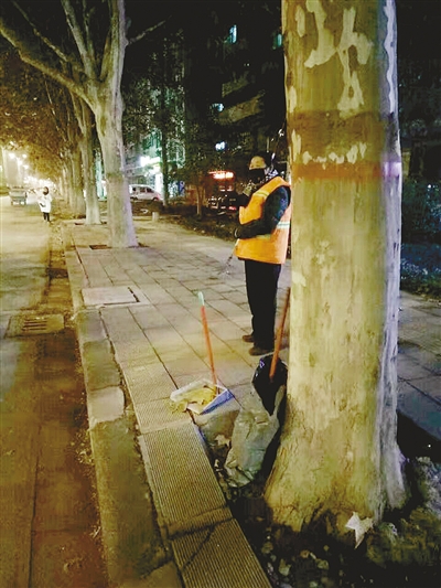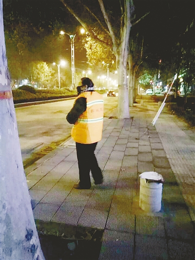 記者通過網(wǎng)友“馮馮馮馮馮好聽啊”聯(lián)系到拍攝這組照片的網(wǎng)友“微微的微笑”。她告訴記者:“11月26日晚上9點左右,我經(jīng)過市區(qū)黃河路與舟山路交叉口附近時,看到這位環(huán)衛(wèi)工人,就拍了幾張照片。”