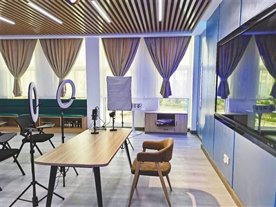 在網(wǎng)紅直播間,直播支架、擴音器、電子顯示屏等設(shè)備齊全(如圖)。“需要帶貨直播、有紅色文化傳播需求的,可以來這里免費使用場地和設(shè)備。”該負責人說。