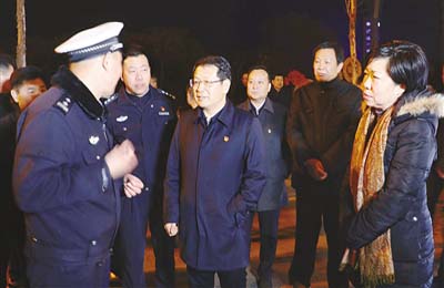 12月24日晚,市委書記蒿慧杰在金山路與龍江路交叉口交通管控卡點(diǎn),察看環(huán)保管控措施落實(shí)情況并實(shí)地督導(dǎo)檢查。記者 王慶建 攝