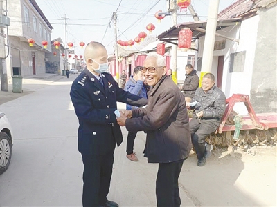 2月11日(大年三十),全國公安楷模、臨潁縣公安局皇帝廟派出所指導員、駐村民警兼大袁村黨支部副書記陳曉磐早早來到大袁警務室,與藏學亮、何帥等新時代警務志愿服務隊隊員一起,為轄區(qū)優(yōu)秀老黨員、優(yōu)秀退役軍人、警務室身邊好人、治安積極分子等送紅包賀新春。這是他們每年春節(jié)堅持開展的活動。