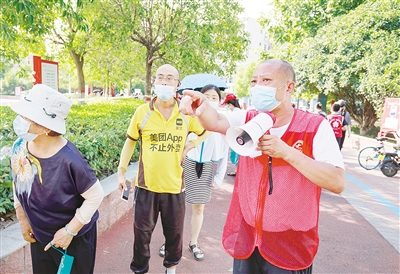 “大家排好隊(duì),十人一組,不要著急。”8月7日,在開來怡景小區(qū)旁的核酸檢測采樣點(diǎn),開來怡景小區(qū)業(yè)委會(huì)主任張曉伍幫忙維持現(xiàn)場秩序。從早上9點(diǎn)忙到晚上10點(diǎn),他的嗓子啞得說不出來話。