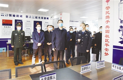11月12日,市委書記劉尚進等到皇帝廟鄉(xiāng)大袁村曉磐警務工作室看望模范人物陳曉磐。記者 胡鴻麗 攝