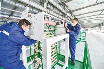 1月30日,位于郾城區(qū)孟廟鎮(zhèn)的中科新投(漯河)新材料有限公司車間內,工人們正在安裝新設備。該公司成立于2022年4月,注冊資本2億元,主要生產可降解的環(huán)保購物袋、外賣餐盒、農用地膜等,年產量預計達50萬噸。記者 焦海洋 攝