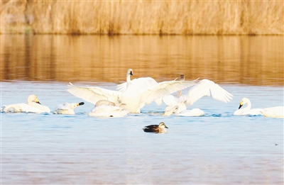 白天鵝在湖中嬉戲。記者 楊 光 攝