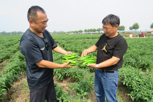 圖為石拐村黨支部書記、臨潁縣自安種植專業(yè)合作社負(fù)責(zé)人邢自安(右)石拐村第一書記張釗(左)在辣椒基地查看今年的辣椒長勢(shì)、辣椒品質(zhì)時(shí)的情景。