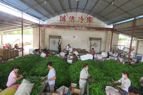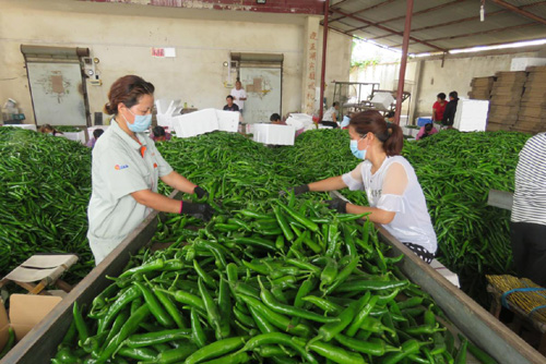 圖為臨潁縣王孟鎮(zhèn)石拐村自安產(chǎn)業(yè)扶貧基地的社員們,在冷庫為辣椒分揀、裝箱、冷藏時(shí)的情景。