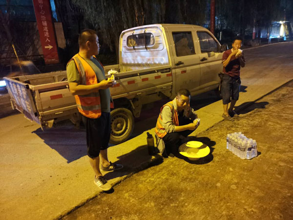 近日,源匯區(qū)公路養(yǎng)護(hù)中心養(yǎng)護(hù)人員加班加點(diǎn)奮戰(zhàn)在五一南路、交通南路金江路施工一線,動(dòng)用二百余人次、上百輛車次,頂烈日、趕工期,加班加點(diǎn)吃在一線、拼在一線,為了節(jié)省時(shí)間,晚飯就蹲在路邊囫圇吞棗的把飯吃了。“最難受的是夏天道路鋪油層,溫度能達(dá)到一百七八十度,隔著二十幾米遠(yuǎn)也像架在火上烤。”養(yǎng)護(hù)工笑著說。連日來的高溫,早已將他們的臉曬得黝黑,身上的衣服已經(jīng)被汗水浸濕,濕了又干,干了又濕。他們冒酷暑戰(zhàn)高溫放棄休息時(shí)間,開展道路維修工作,為了給市民提供一個(gè)暢潔的通行環(huán)境。