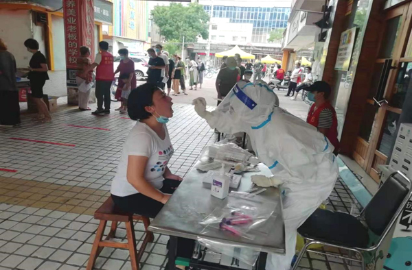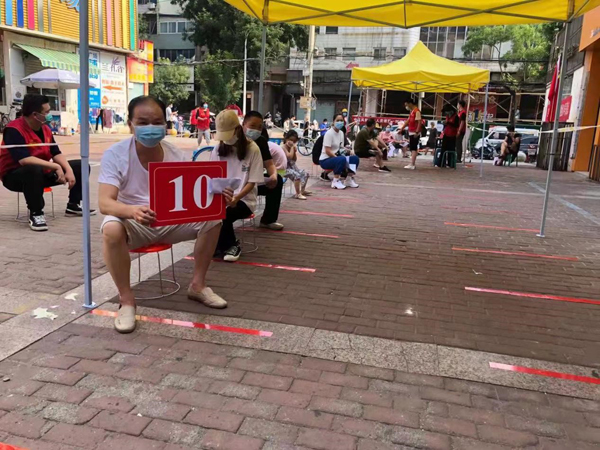 在各檢測點筆者看到,身穿紅馬甲的志愿者忙忙碌碌搞服務,身穿防護服的醫(yī)護人員一絲不茍地在采集樣本,不時有各級領導、衛(wèi)健委的專家巡回開展工作指導。在長申玉檢測點,把居民分小區(qū)、按樓棟組織參加檢測,嚴格做到間隔一米線,不扎堆,不聚集;馬路街辦事處14號檢測點在嚴格執(zhí)行一米線的同時,還提前對居民按照10人一組分組排號,有力提高了檢測效率,志愿者還幫助有困難的群眾看護孩子、開展信息登記等工作。
